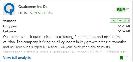 QCOM is firing on all cylinders in key growth areas: automotive and IoT revenues surged 61% and 36% year-over-year, driven by its Snapdragon platforms, while overall revenue jumped 17% to $11.7 billion last quarter. Its net income rose to $3.2 billion (EPS of $2.83), supported by solid demand for premium-tier chips in smartphones and PCs. QCM has a high FCF margin of 32% which highlights strong cash generation, giving the company flexibility for reinvestment, dividends, or debt reduction. Its low debt-to-equity ratio of 0.54 reflects prudent leverage and lower financial risk. With a solid 42% ROE, the company demonstrates efficient use of shareholder capital to drive profitability.
